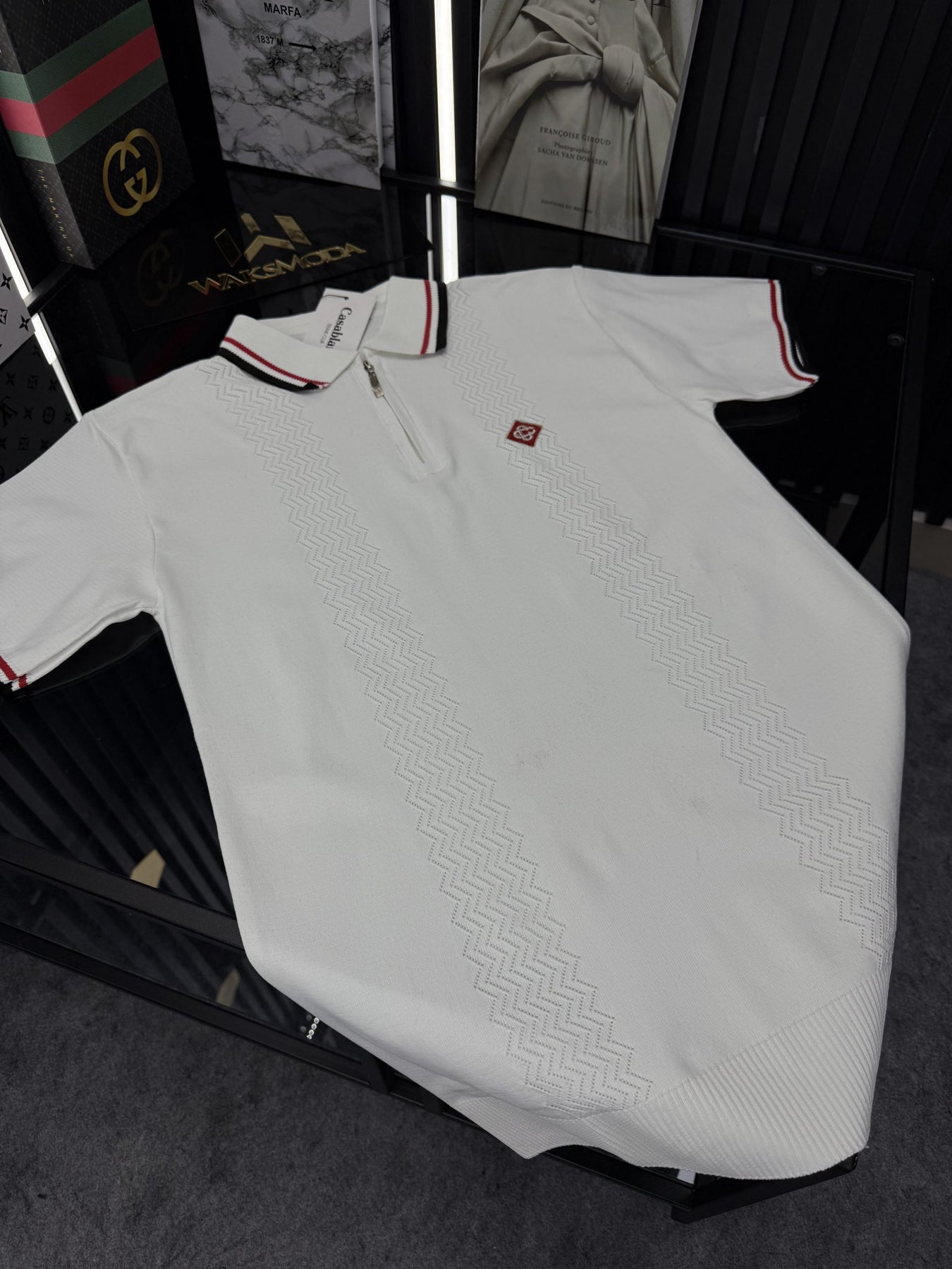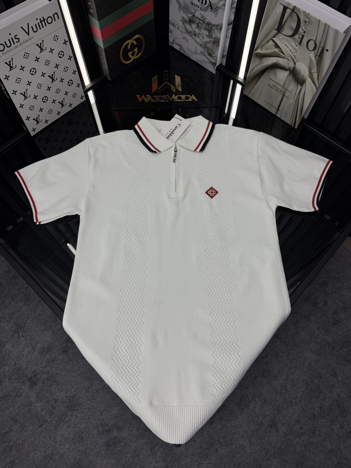 AMİ Örme Triko Fermuarlı Yakası Şeritli Tshirt /Beyaz