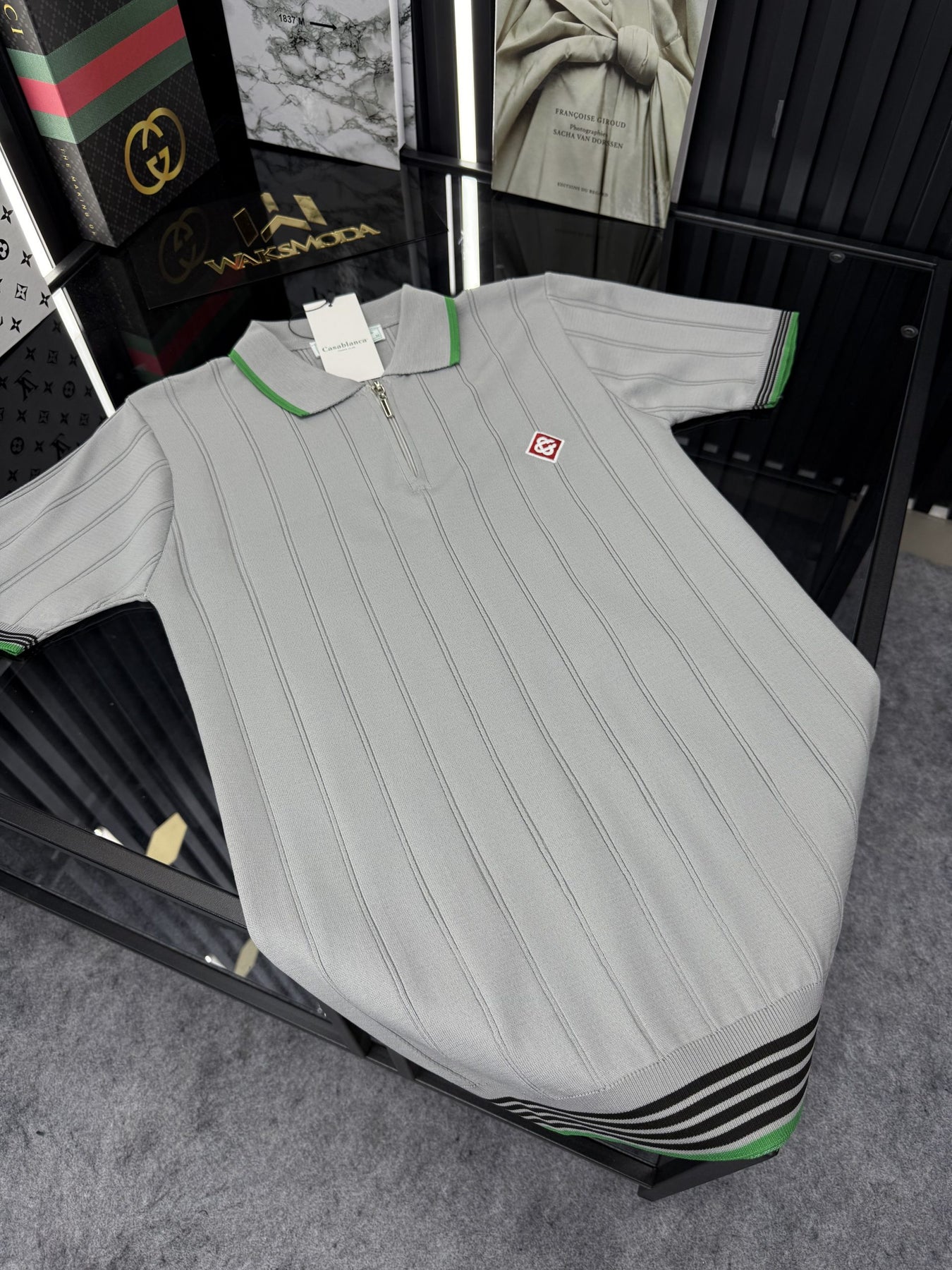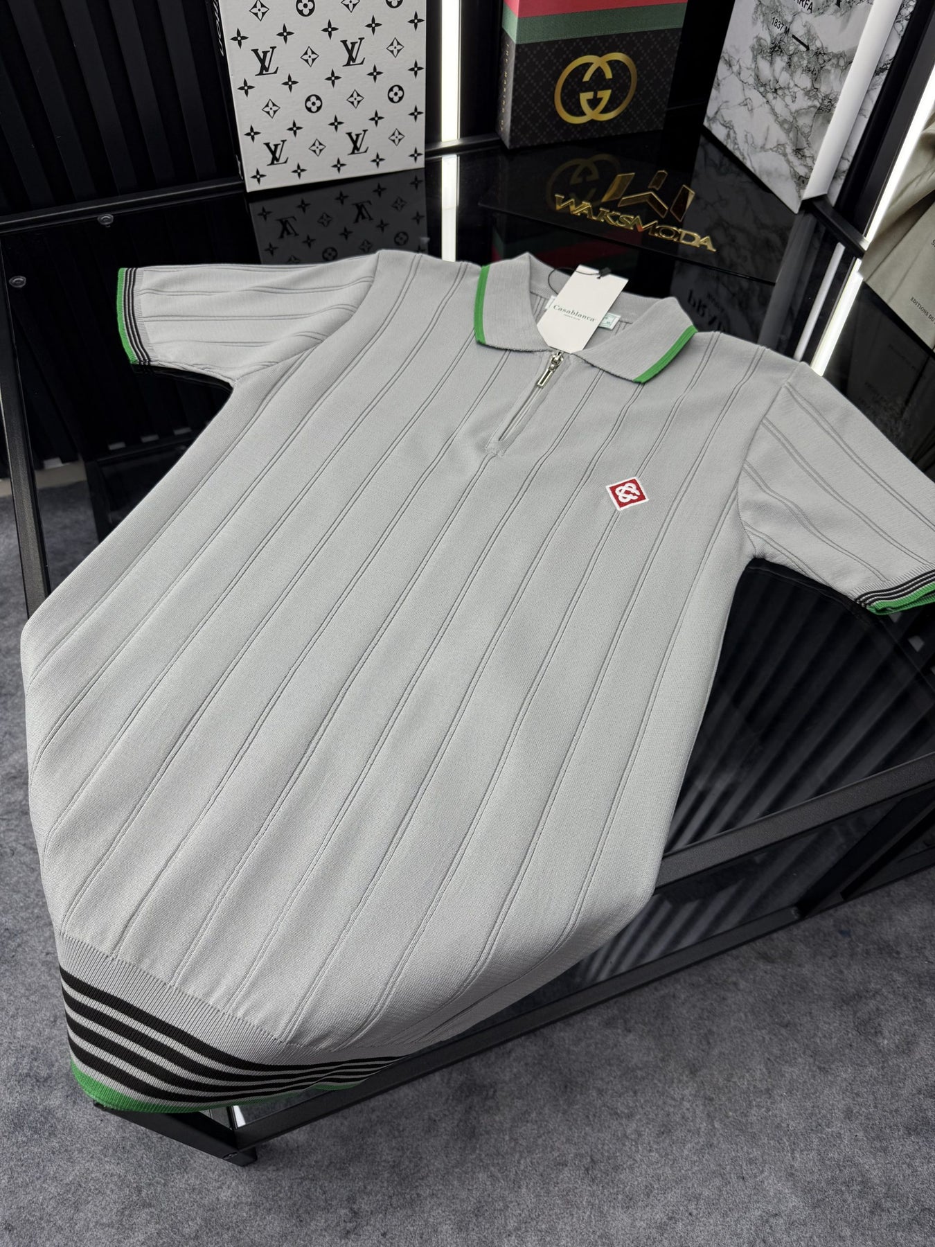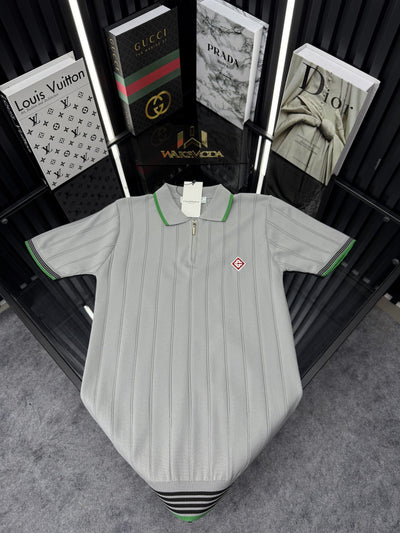 CSBLNC Polo Yaka Örme Triko Tshirt /Gri-Yeşil Şeritli